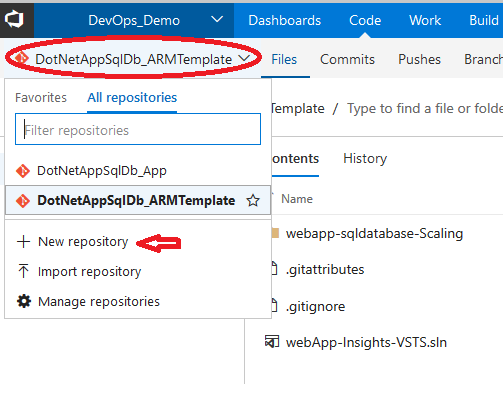 To create a new code repository in VSTS go to the project you want the repository to reside in and select the Code tab. Click the repository drop down and click New repository. A box appears, enter the name for the new repository and select Git type. You now have a new repository.